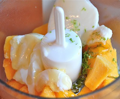 In a blender, whirl the mango; 3/4 cup plain low-fat yogurt; 1 tablespoons honey; the fresh lime juice, 1 tablespoon of water and the freshly grated lime zest until smooth. Divide mango-lime smoothie between 2 straight-sided glasses and set aside.